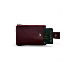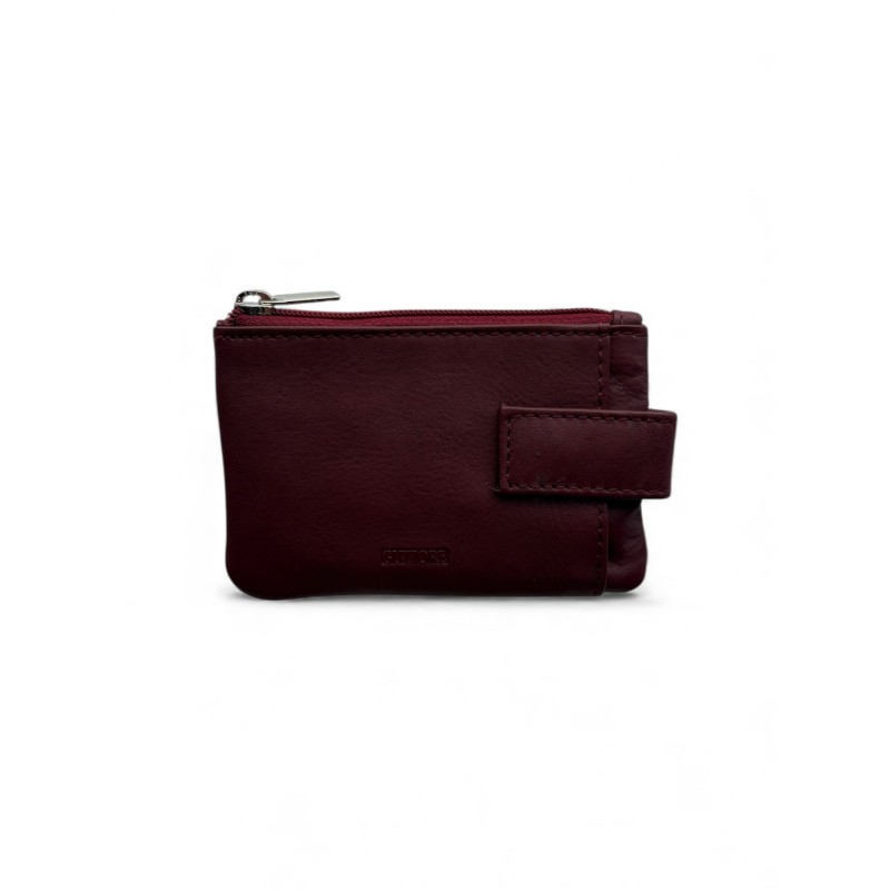 Monedero de piel vacuno con dos bolsillos con cremallera y un bolsillo para para tarjetas con cierre a presión, incluye un llavero dentro.
